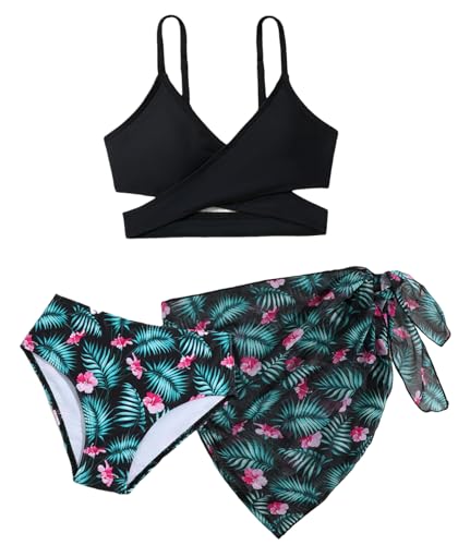Momkonzz Girls Swimming Costume Kids Swimsuits Bikini Set 3 Piece Bathing Suits Teen Flower Bikini Strap Set with Skirt Cover Up Surfing Beach Swimwear Black 13-14 Years