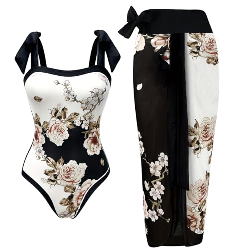 Xumplo Women's Swimming Costume 2 Piece Swimwear Floral Adjustable Bow-Tie Shoulders Matching Cover Up Skirt Swimsuits Bathing Suit-M Black