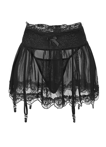 MIZSPISE Women Sexy Suspender Mini Skirt with Panties Sheer Mesh Lace-up Mini Dress Lingerie Underwear Garter Belt (black, one size)