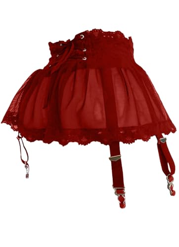 MIZSPISE Women Sexy Suspender Mini Skirt with Panties Sheer Mesh Lace-up Mini Dress Lingerie Underwear Garter Belt (wine red, one size)