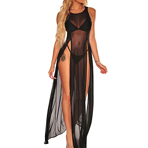 Women Summer Beach Bikini Cover Up, Mesh Swimwear Skirt Tops, Sheer Swimsuit Scoop Neck Tank Maxi Dress Chiffon Beachwear Coverup See Through Blouse Loungewear for Ladies Bodycon Clubwear Sundress
