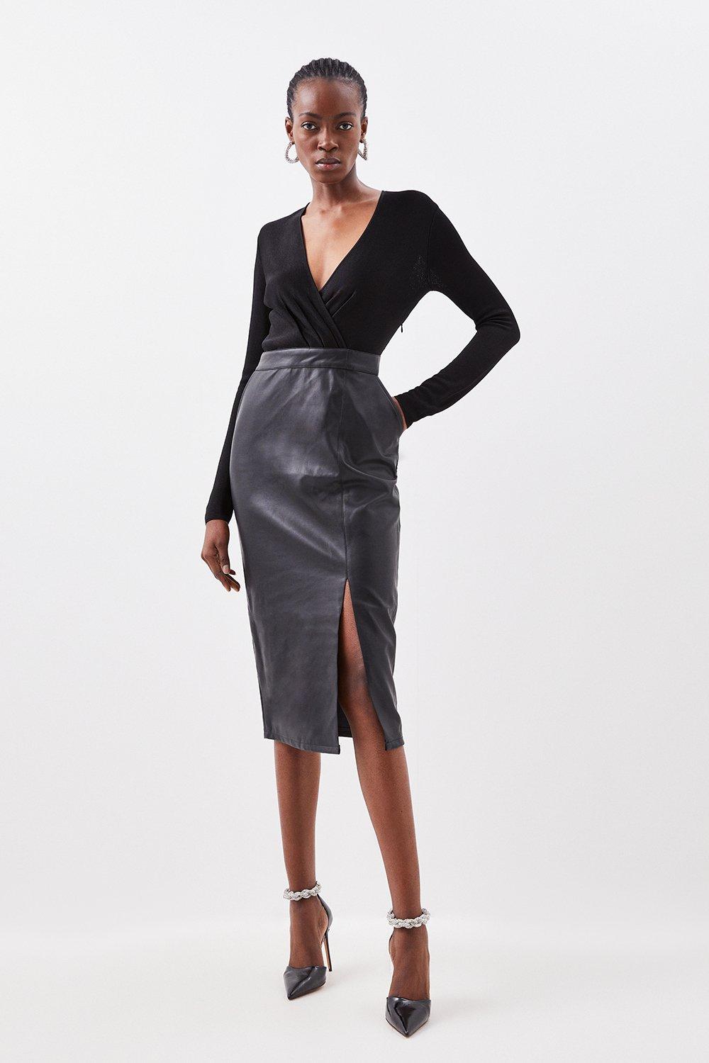 Pu Skirt Sheer Knit Midi Dress