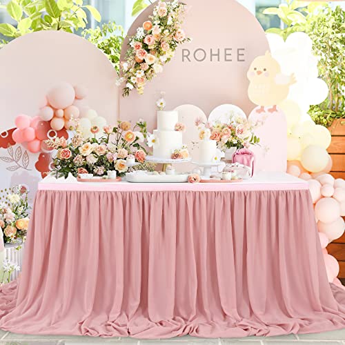 14FT Dusty Rose Chiffon Table Skirt Sheer Rectangle Tablecloth for Wedding 1st Baby Girl Birthday Party Bridal Shower Decoration