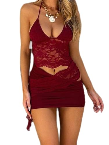 LYSINK Women's Y2k Summer Skirt Set Sheer Lace Halter Camisole Top Asymmetrical Ruched Mini Skirt Floral Embroidery 2pcs (A-Red, S)