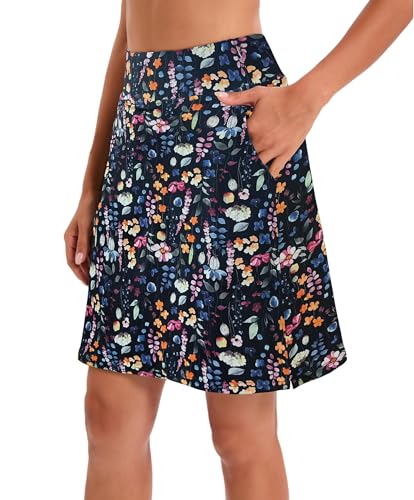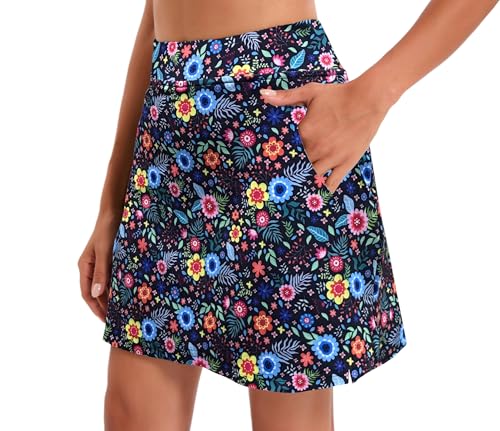 Oyamiki A Line Skirt Shorts for Women UK High Waist Knee Length Skirts with 4 Pockets Tennis Golf Skort Colourful Flowers Navy XL