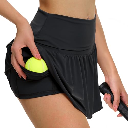 zffriction Women's Tennis Skirt with Shorts Pockets Pleated Golf Skort Sport Skirts High Waisted Mini School Skirt Workout Running (UK, Alpha, L, Regular, Regular, Black)