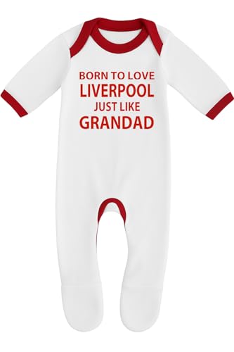 Cheekytots Baby Sleepsuit – Born To Love Liverpool Just Like Grandad – 100% Cotton Baby Romper (3-6 Months, White/Red Trim)