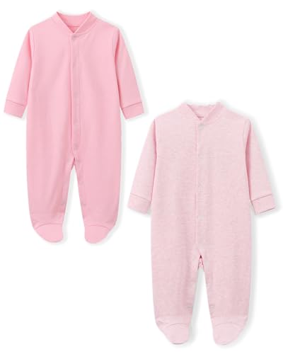 BINIDUCKLING Baby Boys Girls Snap-Up Sleepsuit, Cotton Baby Footed Pajamas - Long Sleeve Baby Grows Sleepwear for 9-12 Months, Pink and Pink with White Spot