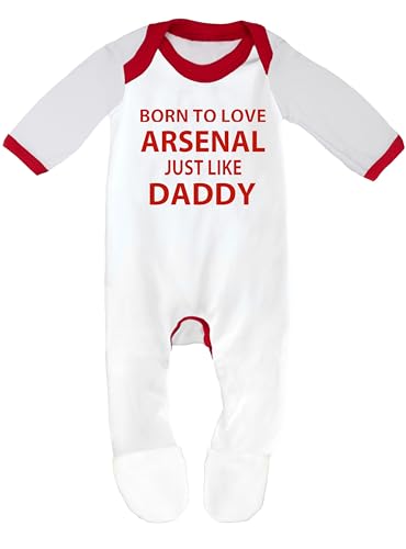 Cheekytots Baby Sleepsuit – Born To Love Arsenal Just Like Daddy – 100% Cotton Baby Romper (3-6 Months, White/Red Trim)