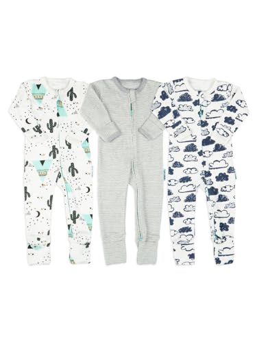 100% Cotton, Two-Way Zipper Baby Sleepsuit for Boys and Girls, Footless with Fold Over Cuffs on Hands and Feet, 3 Pack Blues, 0-3 Months