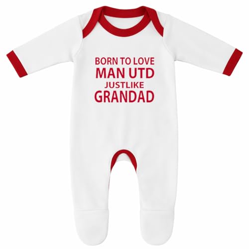 Cheekytots Baby Sleepsuit – Born To Love Man Utd Just Like Grandad – 100% Cotton Baby Romper (3-6 Months, White/Red Trim)