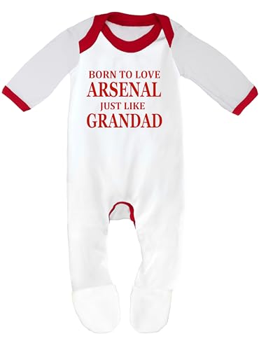 Cheekytots Baby Sleepsuit – Born To Love Arsenal Just Like Grandad – 100% Cotton Baby Romper (3-6 Months, White/Red Trim)