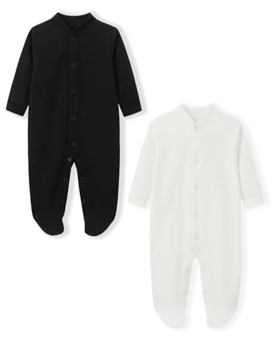 BINIDUCKLING Baby Boys Girls Snap-Up Sleepsuit, Cotton Baby Footed Pajamas - Long Sleeve Baby Grows Sleepwear for 3-6 Months, Black and White