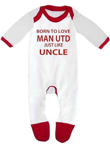 Cheekytots Baby Sleepsuit – Born To Love Man Utd Just Like Uncle – 100% Cotton Baby Romper (0-3 Months, White/Red Trim)
