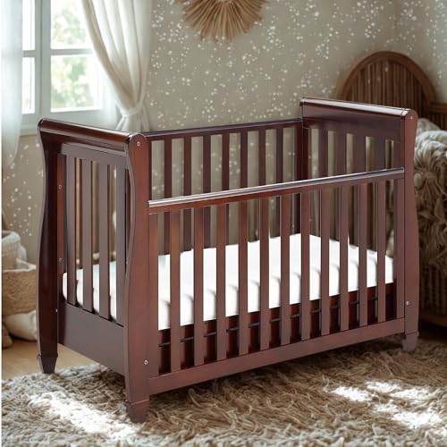 Babymore Eva Sleigh Cot Bed Brown - Drop Side Cot With Mattress Included, Baby Cot With Teething Rail & Drawer, Convertible to Toddler Bed & Day Bed | 3 Adjustable Bed Base Positions (Brown)