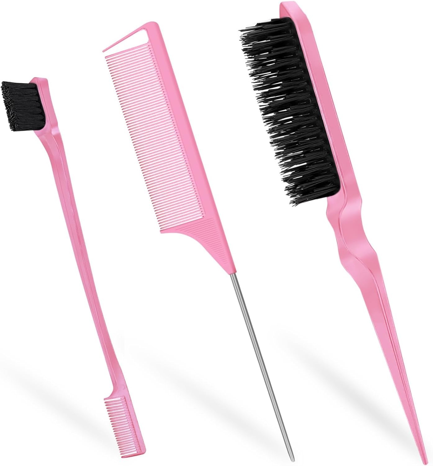 Qufiiry 3-Piece Hair Slick-Back Brush Set - Teasing & Edges Brush for Women's Salon Styling - Pink