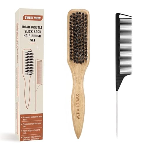 SWEET VIEW Boar Bristle Slick Back Hair Brush for Smooth Flyaways, Frizz, Sleek Ponytail, Buns and Edge Baby Hair, Teasing | Gel Comb, Styling Accessories for Girls, Kids and Women