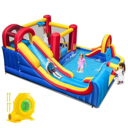 Warmiehomy Inflatable Bouncy Castle with Ball Pit and Slides, Bounce Water Park with Jump House Basketball Game, Play House for Kids Age 3-8 Indoor Outdoor Garden Park Backyard Children Birthday Gift
