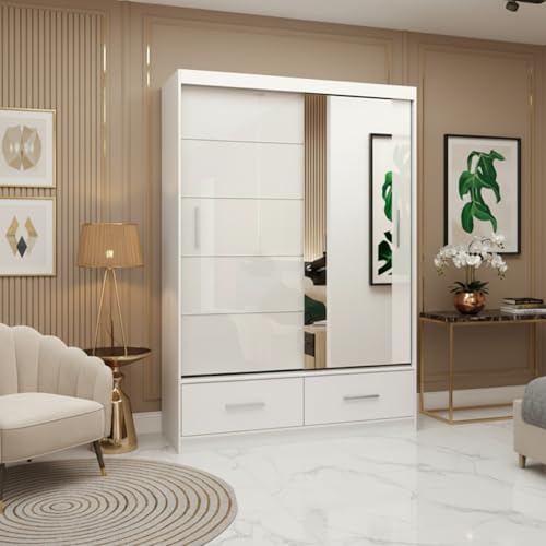 Clothing Estates Florence 150 Wardrobe with Mirror Large Sliding Door Cupboard Storage Dimensions 150cm x 61cm x 218cm White Semi Gloss