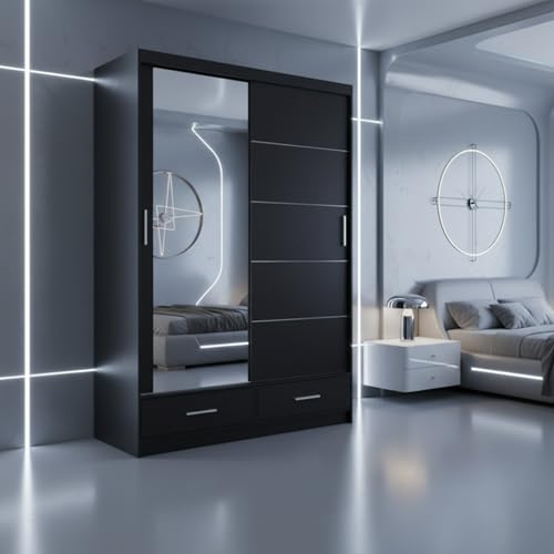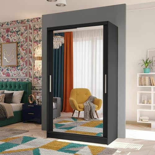 FURNITUREWAVE Vista Double Sliding Door Mirror cupboard, 2 Door cabinet with Hanging Rails & Adjustable Shelves, Space Saving Wardrobe for Bedroom (Black, 120cm)