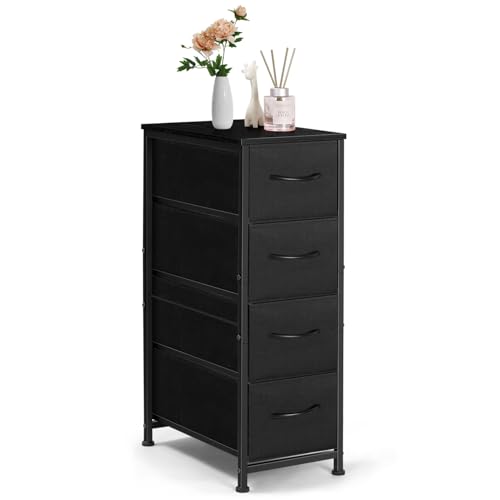 MUTUN Narrow 4 Drawers Chest Dresser, Bedroom Fabric Storage Drawer with Wood Top, Tall and Slim Cupboard Nightstand End Table Organizer Unit for Bathroom, Hallway, Living Room, Closet, Office Black