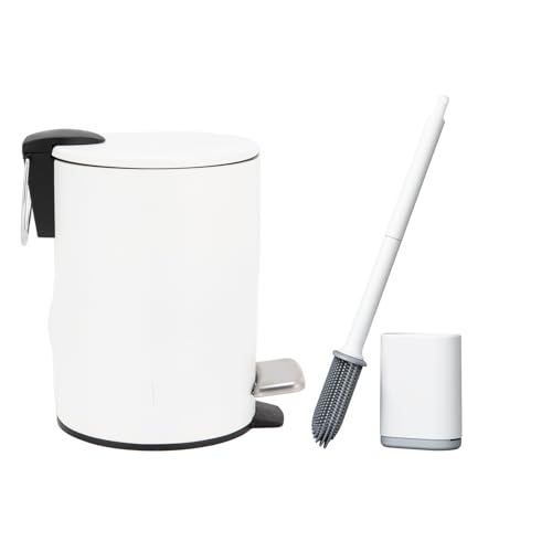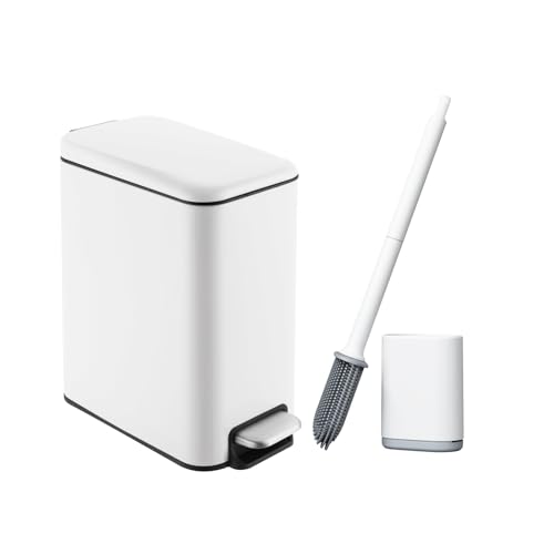 ianomla Bathroom Bin, 1.1 Gallon (5L) Trash Can with Toilet Brush,Small Steel Pedal Slim Bin with Inner Bucket, Soft Close and Stays Open, for Living Room, Bedroom and Kitchen, Rectangle, White