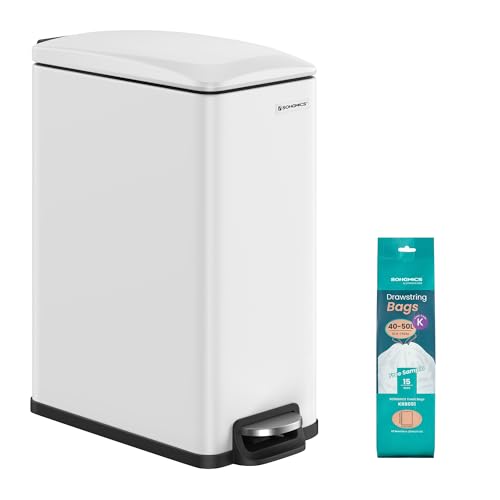 SONGMICS Kitchen Bin 48L, Slim Pedal Bin for Narrow Spaces, Rubbish and Waste Bin with Soft-Close Lid and Inner Bucket, Steel, 15 Rubbish Bags Included, White LTB510W4802