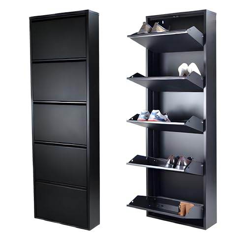 Atahome Slim Shoe Cabinet Tall Narrow Shoe Storage Cabinet for hallway wall mounted thin flip down Metal Shoe Rack Storage Organiser Shoe cupboard Indoor Lydia 5-Drawer Tier (Black)