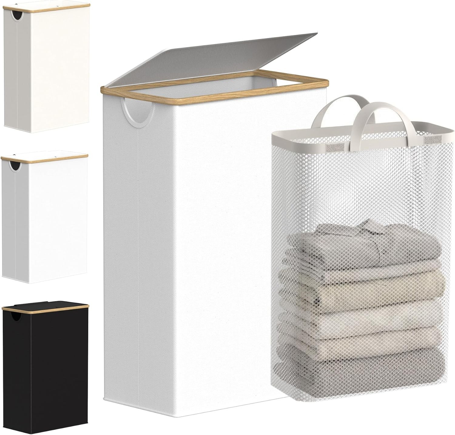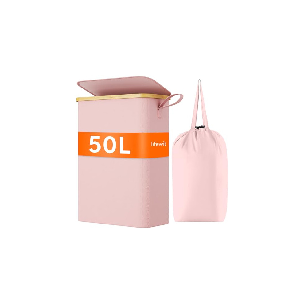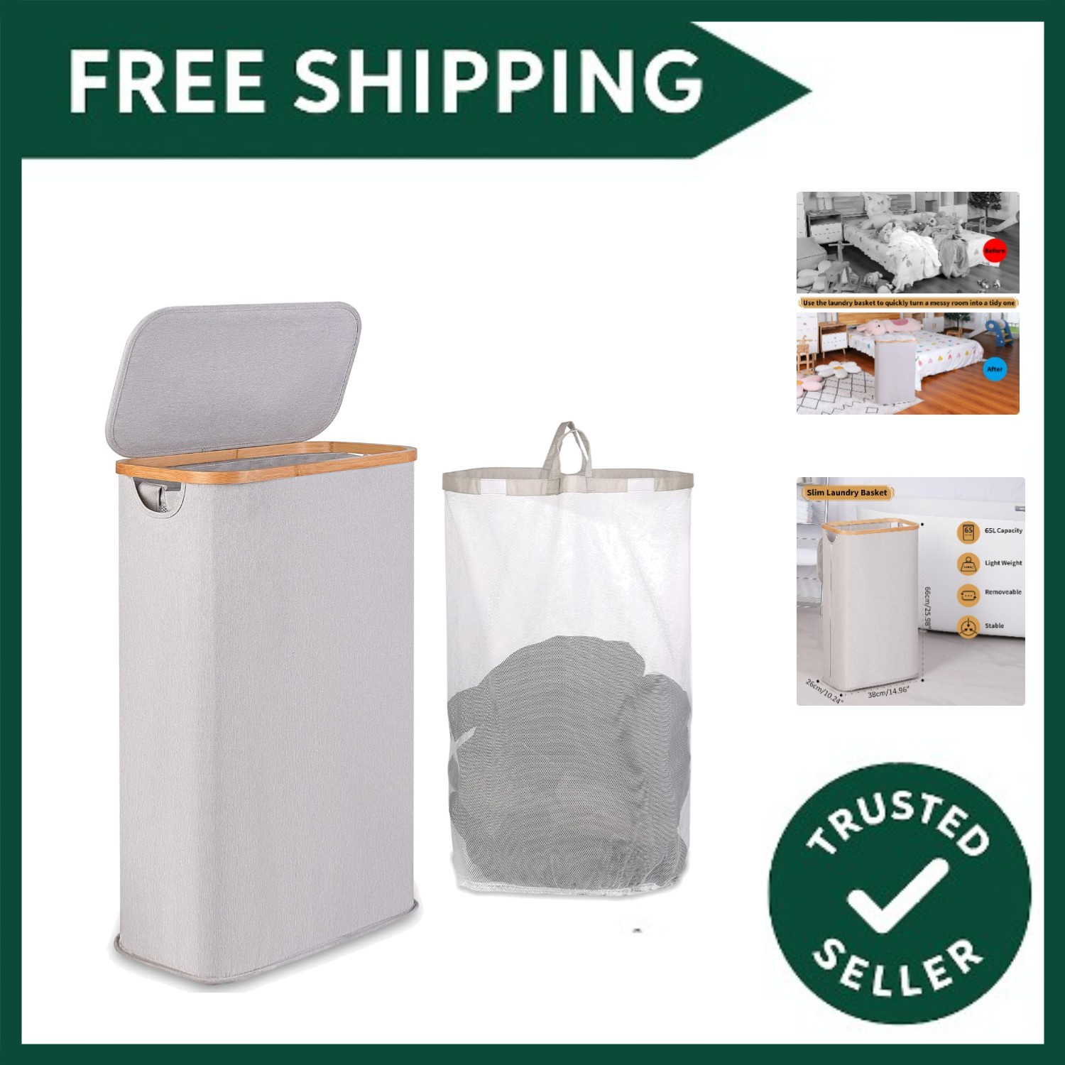 Lifewit 50L Slim Laundry Basket with Lid, Foldable Laundry Hamper Drity Clothes Washing Basket Toys Towels Storage with Bamboo Handle, Removable Inner