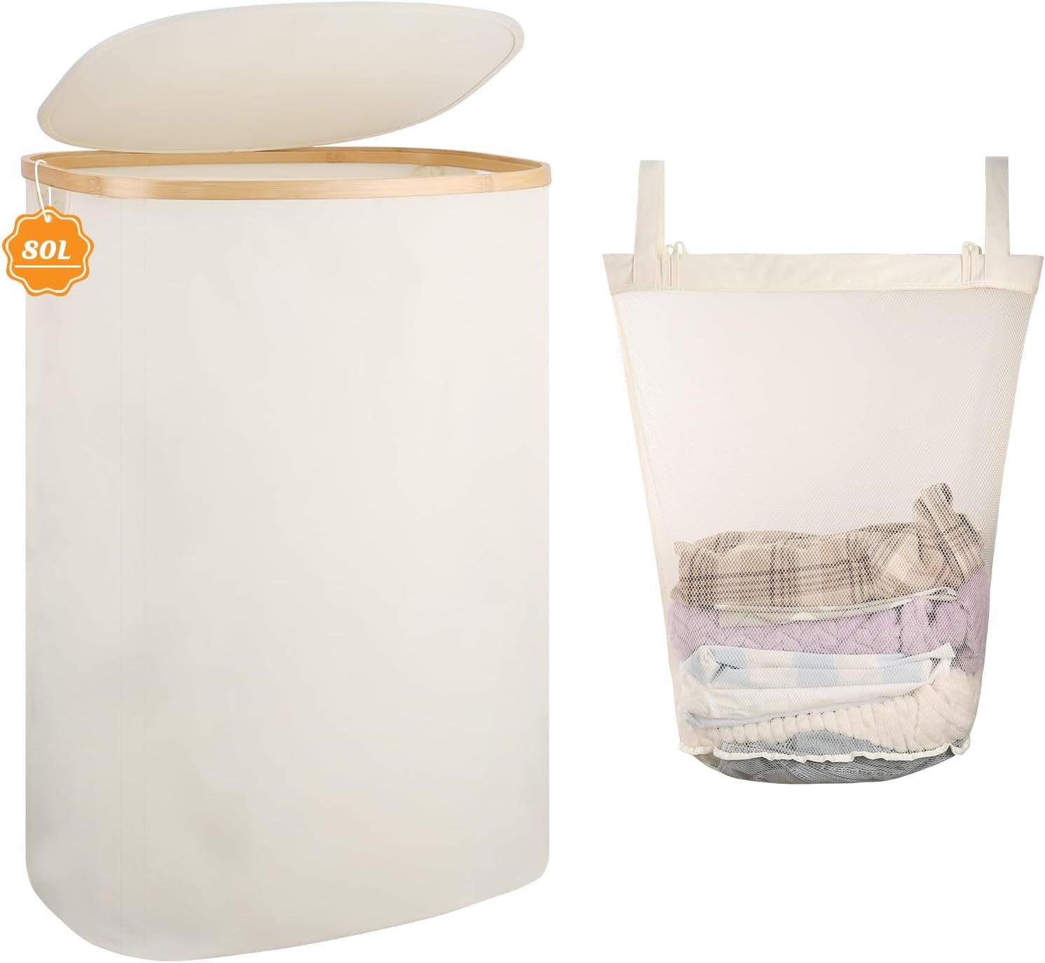 iEGrow Laundry Baskets 60L, Tall Washing Baskets for Laundry with Removable and Washable Inner Bag, Slim Thin Laundry Basket with Lid and Bamboo Handle for Laundry Room Bedroom Bathroom (Beige)