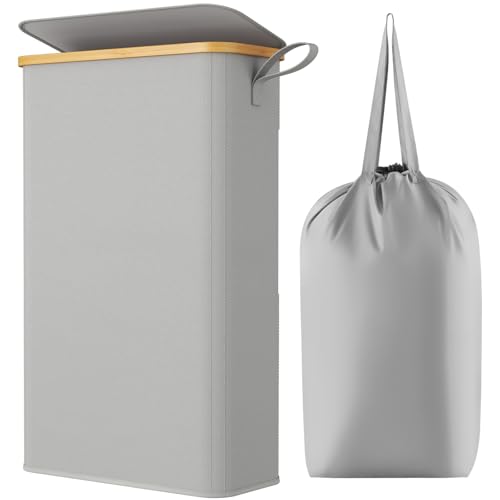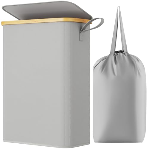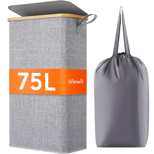 Lifewit 75L Slim Laundry Basket with Lid, Foldable Laundry Hamper Drity Clothes Washing Basket Toys Towels Storage with Bamboo Handle, Removable Inner Bag for Bedroom Bathroom,Light Grey