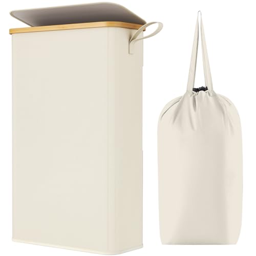 Lifewit 75L Slim Laundry Basket with Lid, Foldable Laundry Hamper Drity Clothes Washing Basket Toys Towels Storage with Bamboo Handle, Removable Inner Bag for Bedroom Bathroom, Beige