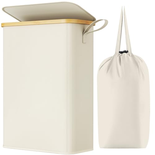 GLOWPOINT 65L Slim Laundry Basket with Lid, Narrow Small Washing Basket for Dirty Clothes with Removable Bag, Cloth Storage Laundry Hamper Bin for Bedroom, Bathroom, Laundry Room, Beige