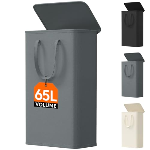Lifewit 65L Slim Laundry Basket with Lid, Small Washing Basket, Narrow Foldable Laundry Bag with Handles, Thin Laundry Hamper Bin Storage for Bedroom Accessories, Gray, 1 Pack