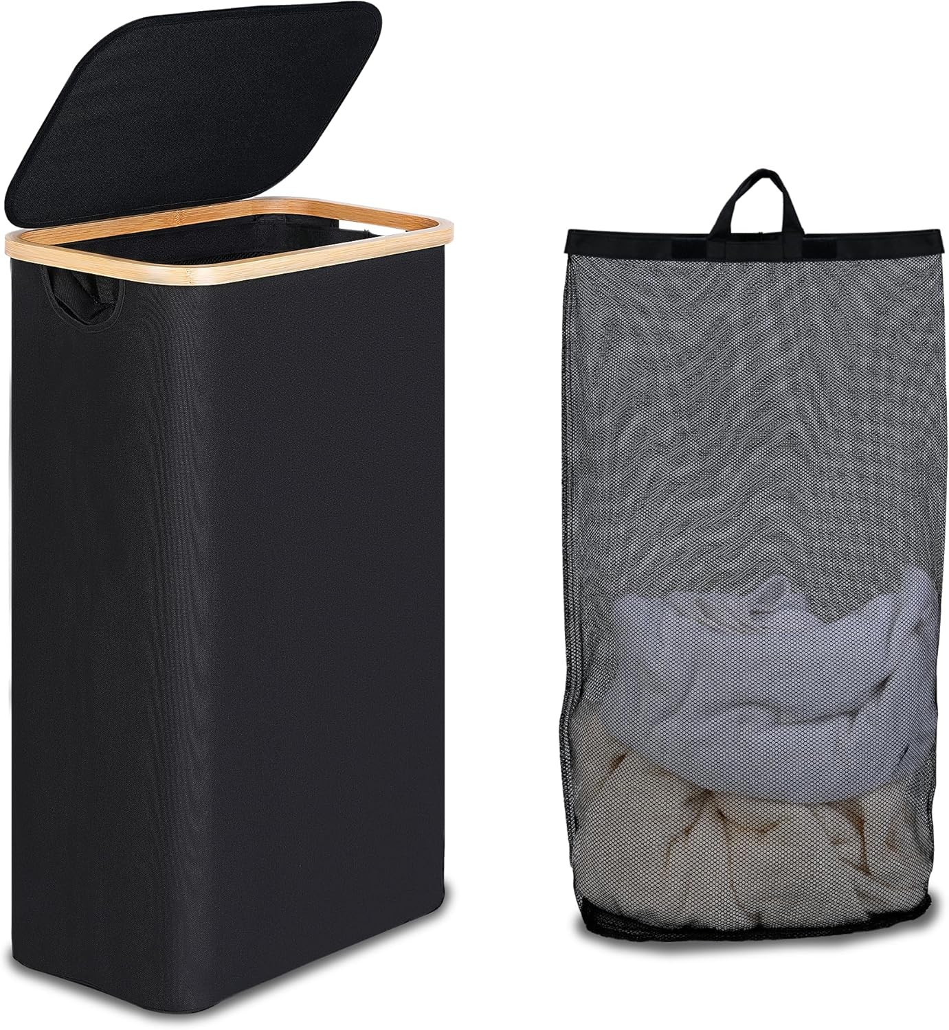 60L Slim Collapsible Laundry Baskets with Lid, Tall Narrow Foldable Washing Basket for Laundry, Folding Small Slimline Laundry Hamper for Dirty Clothes, Bamboo Cloth Wash Storage Basket (Black)