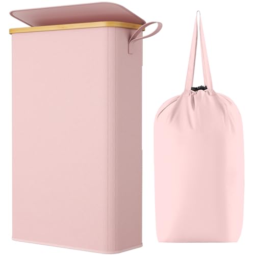 Lifewit 65L Slim Laundry Basket with Lid, Foldable Laundry Hamper Drity Clothes Washing Basket Toys Towels Storage with Bamboo Handle, Removable Inner Bag for Bedroom Bathroom, Pink