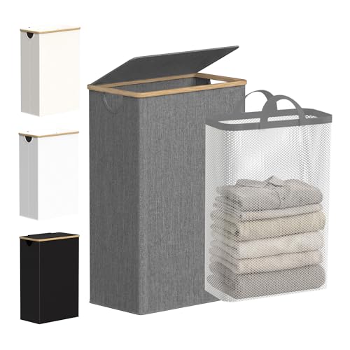 iEGrow Slim Laundry Basket with Lid 60L, Washing Basket with Bamboo Handle and Lid, Foldable Laundry Baskets for Drity Cloth Toys Towels Storage with Removable and Washable Inner Bag (Grey)