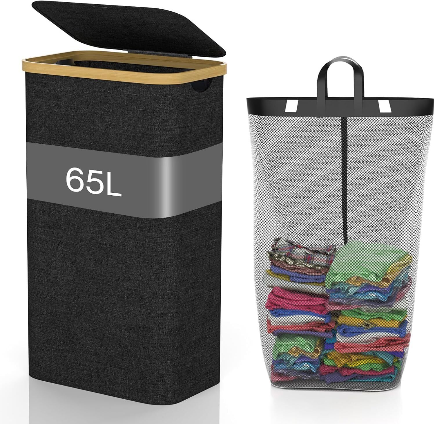 70L Slim laundry Basket with Lid,Inner Bag Removable, Collapsible Narrow Washing Basket for Small Spaces