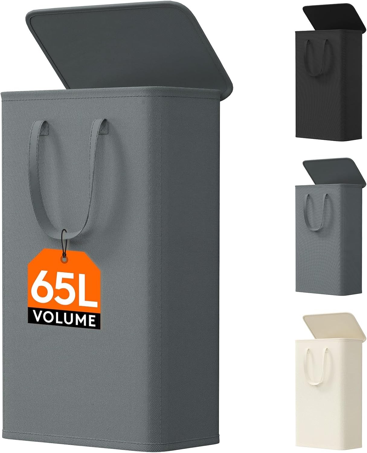 Lifewit 65L Slim Laundry Basket with Lid, Small Washing Basket, Narrow Foldable Laundry Bag with Handles, Thin Laundry Hamper Bin Storage for Bedroom Accessories, Grey
