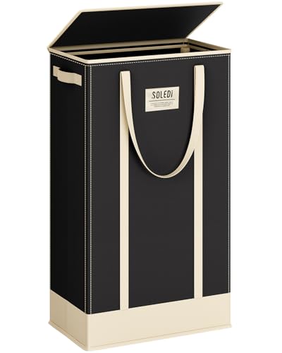 SOLEDI Slim Laundry Basket with Lid, 75L Collapsible Laundry Baskets with Handles Easy to Carry, Washing Basket Clothes Hamper Perfect for Compact Spaces like Bedrooms, Bathrooms, Dorms, RVs (Black)