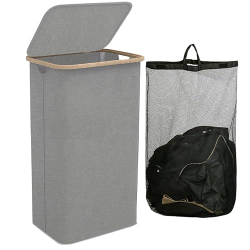 100L Laundry Basket with Lid, removable inner washing bag. Washing Baskets for Laundry with Inner Bag and Handles - Slim Laundry Bin with Bamboo Handles Suitable for Bedroom and Bathroom (Grey)