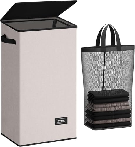 SOLEDI Laundry Basket with Lid 100L Washing Basket Collapsible Laundry Baskets Slim Clothes Hamper Foldable Laundry Bin Laundry Bag for Bedroom, Closet, Bathroom, Dorm(Beige)