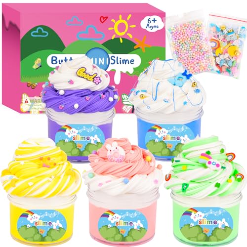 5 Pack Fluffy Butter Slime Kit, Dual Colors Slime Set with Cute Slime Charms, Soft & No-Sticky, Scented Putty Slime for Party Favors, Birthday Gift, Stress Relief Toys for Girls Boys