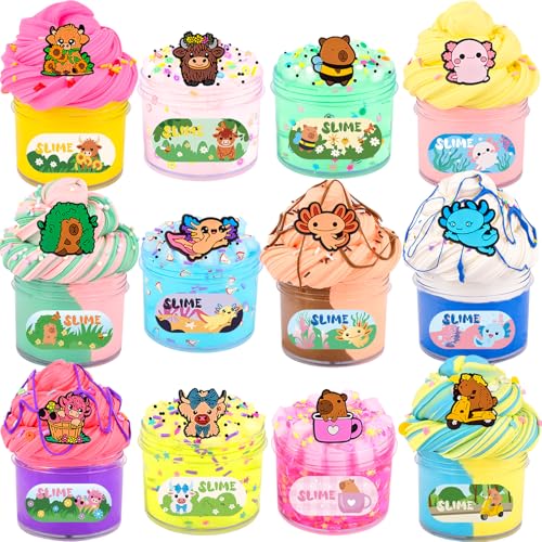 12 Pack Fluffy Axolotl Slime Kit with 7 Pack Butter Slime and 5 Pack Clear Jelly Slimes, Highland Cow Capibara Slime Set for Kids, Putty Sludge Toy Gifts for Girls Boys