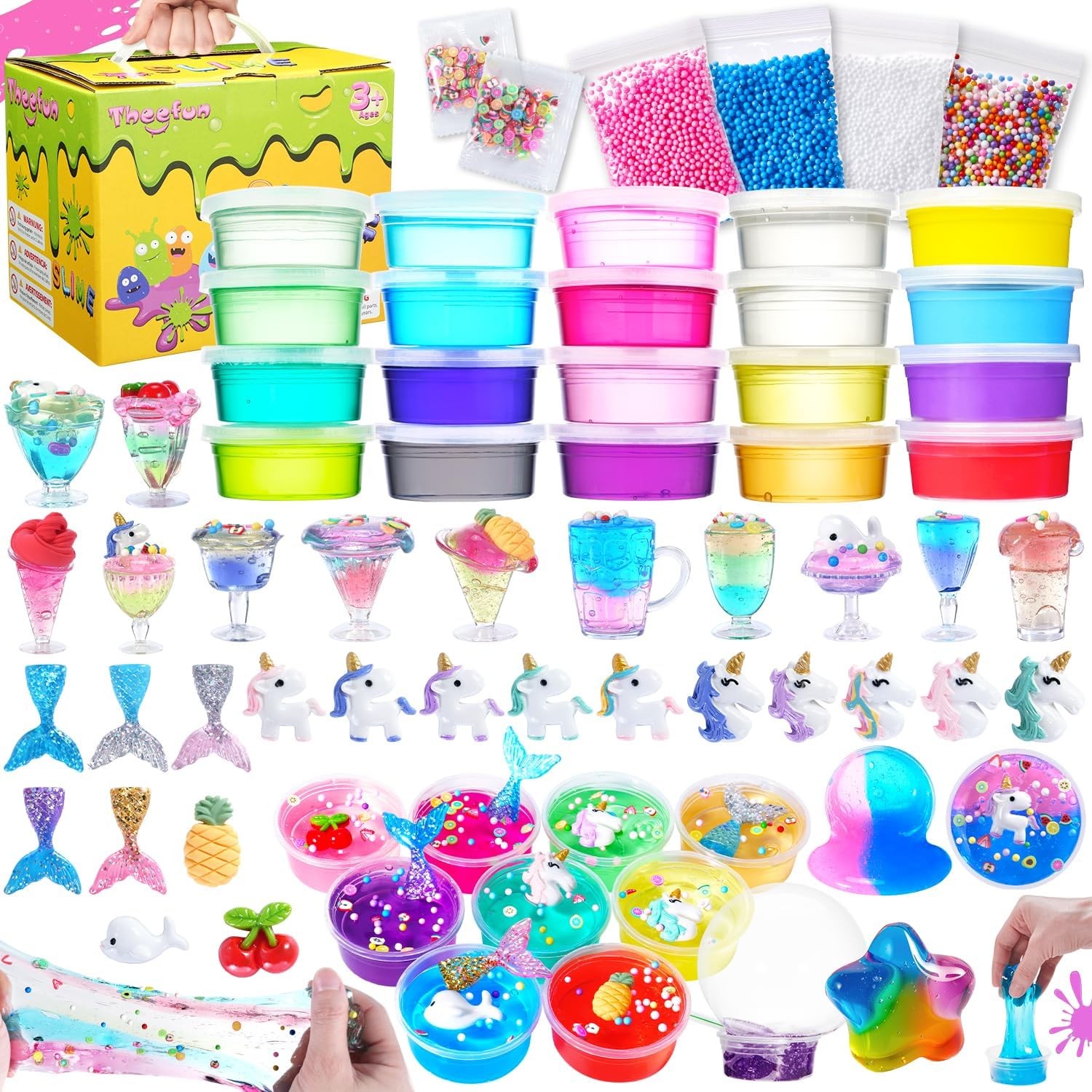 Theefun 60PCS DIY Slime Kit, Slime Making Kit for Girls & Boys include 24 Cups Crystal Mud, 4 Foam Balls, 2 Fruit Slices and Unicorn Charms, Craft Kit, Christmas Birthday Party Gift Toys for Kids 3-12