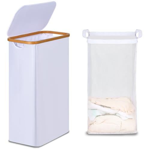 efluky 75L Slim Laundry Baskets with Lid, Collapsible Laundry Hamper with Removable Bag, Small Slimline Washing Basket for Dirty Clothes, Cloth Storage Basket White
