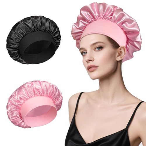 PhieeSeriy 2 Pack Silk Bonnet for Sleeping Women, Adjustable Soft Satin Bonnet for Curly Short Long Hair, Non-Slip Hair Cap with Wide Elastic Band for Night, Sleep Cap, Black/Light Pink