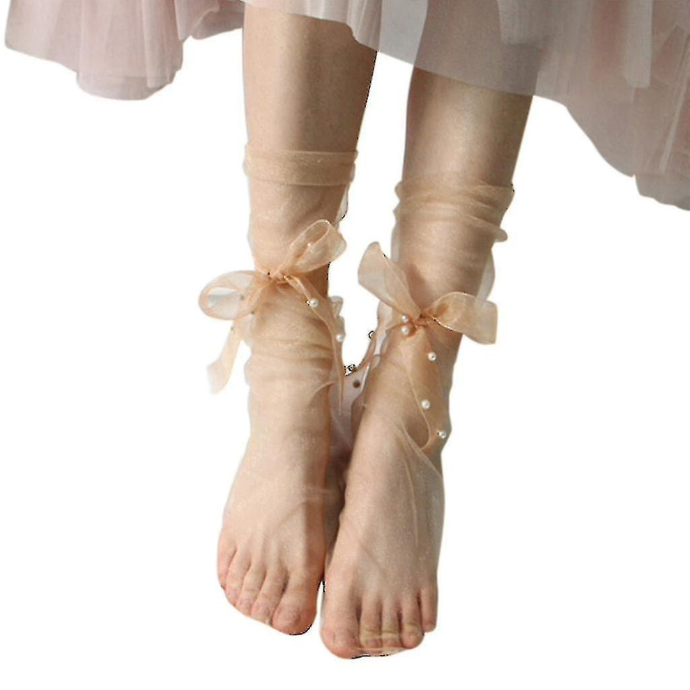 (Skin colour) Women Ultra-thin Sheer Slouchy Ankle Socks Ribbon Bow Pearl Mesh Tulle Stockings