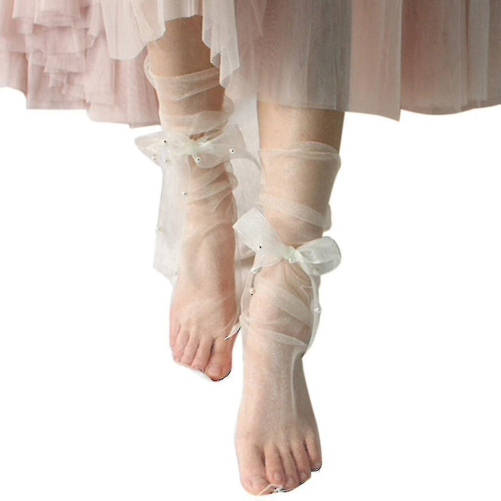 (Beige) Women Ultra-thin Sheer Slouchy Ankle Socks Ribbon Bow Pearl Mesh Tulle Stockings