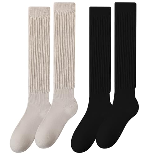 EUPSIIU 2 Pairs Knit Women's Slouch Sock, Long Fluffy Socks Knee High Boot Slouchy Scrunch Socks For Woman Girls, Cotton Extra Long Scrunch Knee High Socks for Fall Winter, One Size (Cotton, 2 Colors)